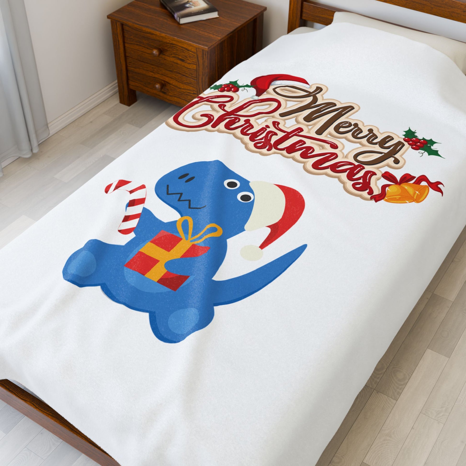 Christmas Dinosaur Velveteen Plush Blanket — "Merry Christmas" Holiday Throw