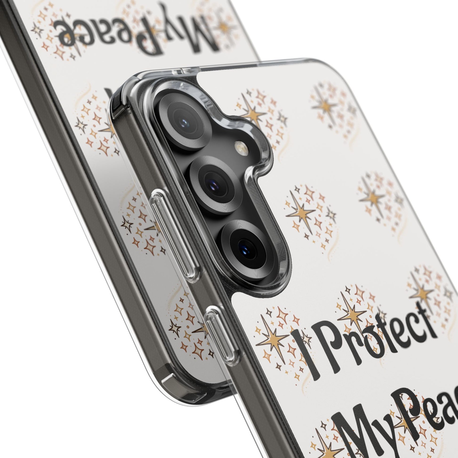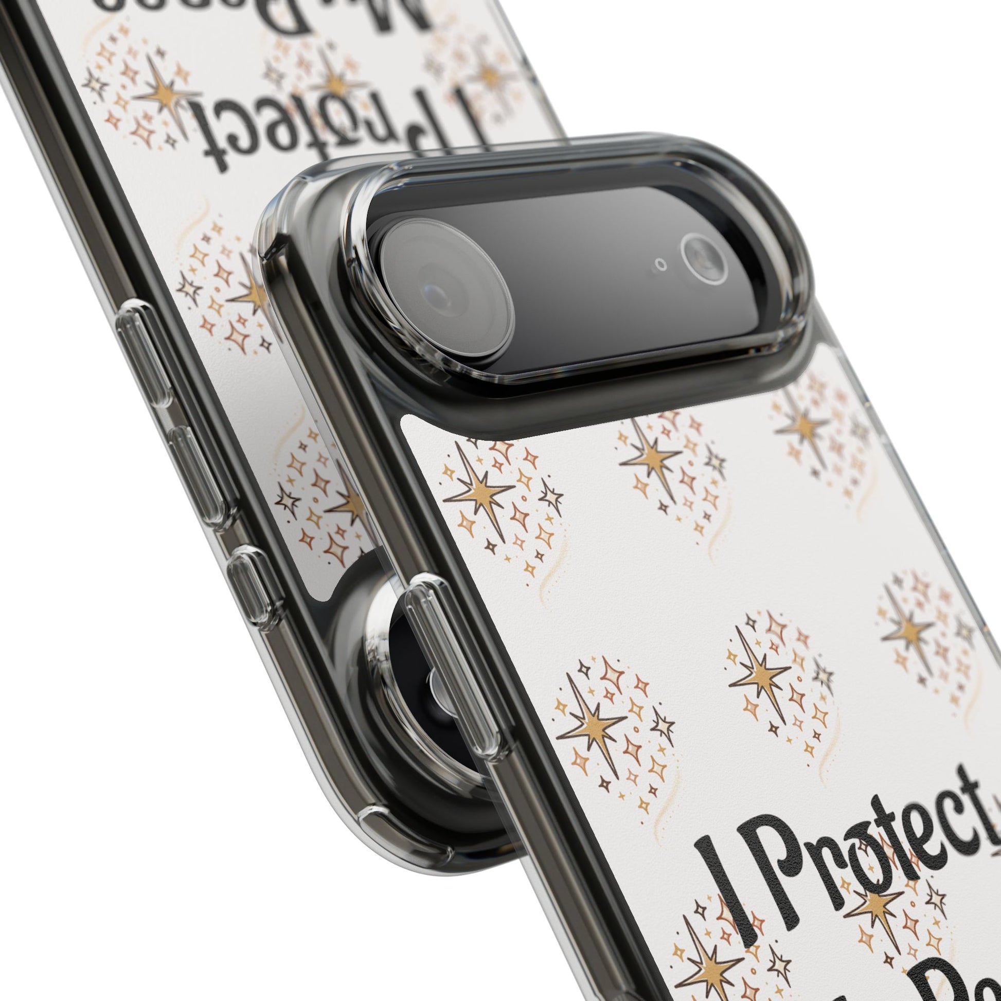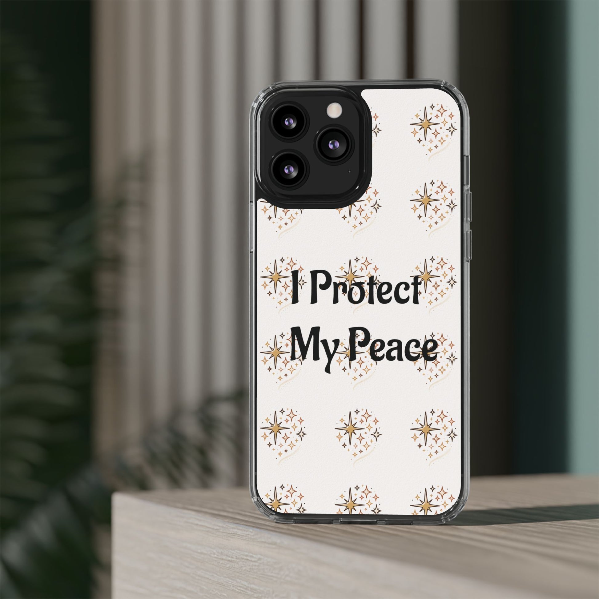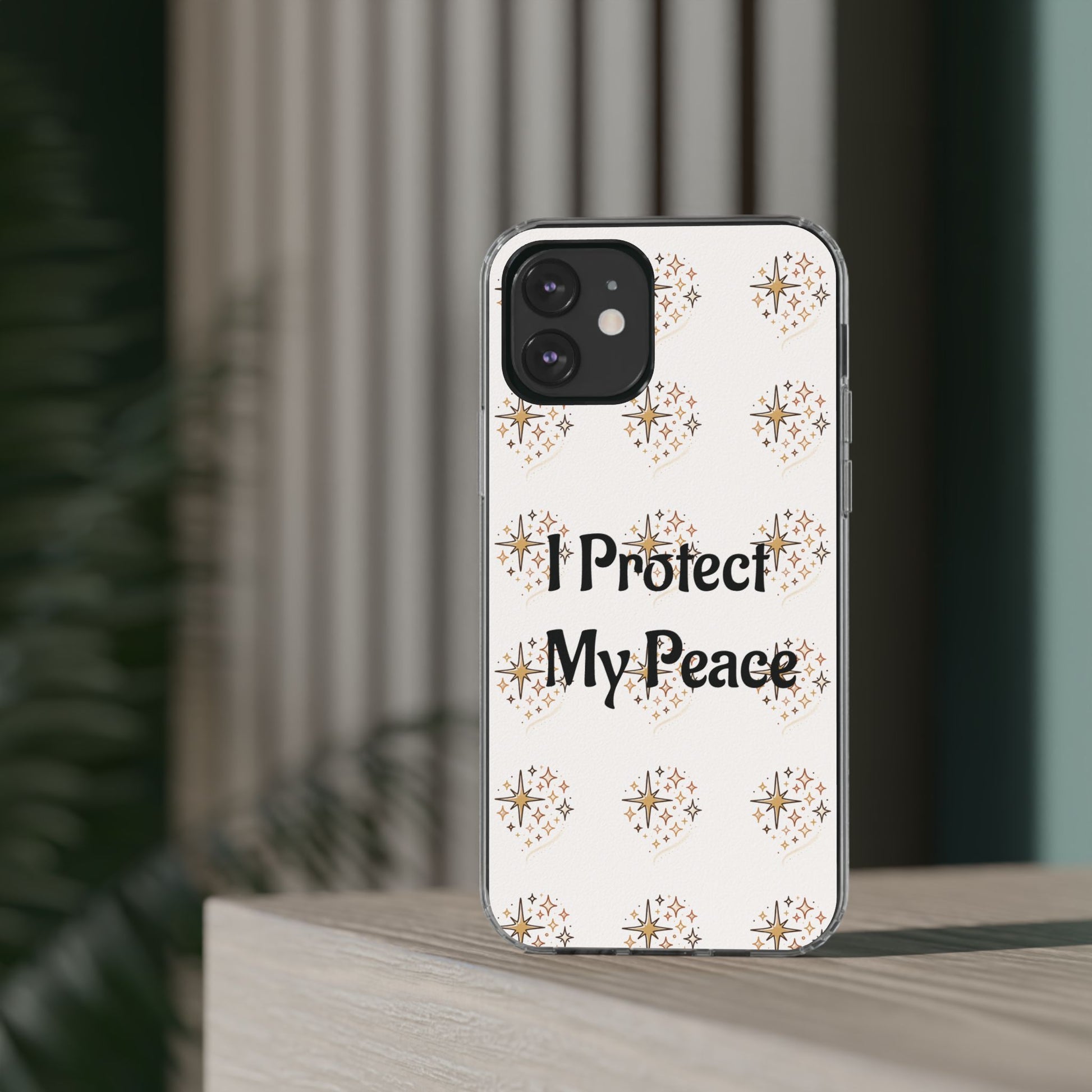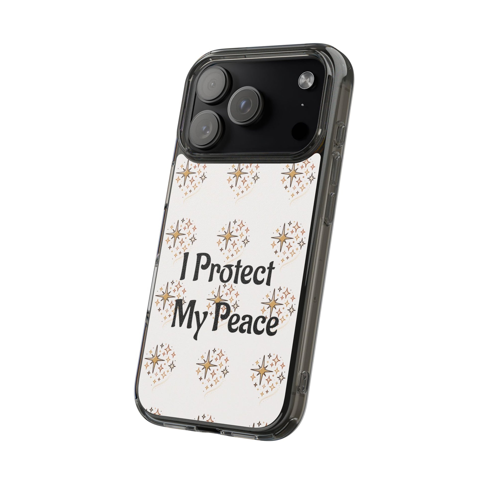 A clear, slim phone case that blends gentle protection with a calm, personal statement. The translucent polycarbonate back showcases a soft, repeating starburst pattern around the centered phrase “I Protect My Peace,” printed with photo-realistic, high-DPI inks that remain vivid edge-to-edge. Smooth glossy or matte finishes lock the design beneath the surface for long-lasting wear, while flexible TPU sides absorb shocks and keep the profile sleek. It slips into everyday life — on a work desk, in a bag, or in a quiet moment at home — letting the owner carry a mindful reminder without sacrificing modern functionality like wireless charging and open port access.