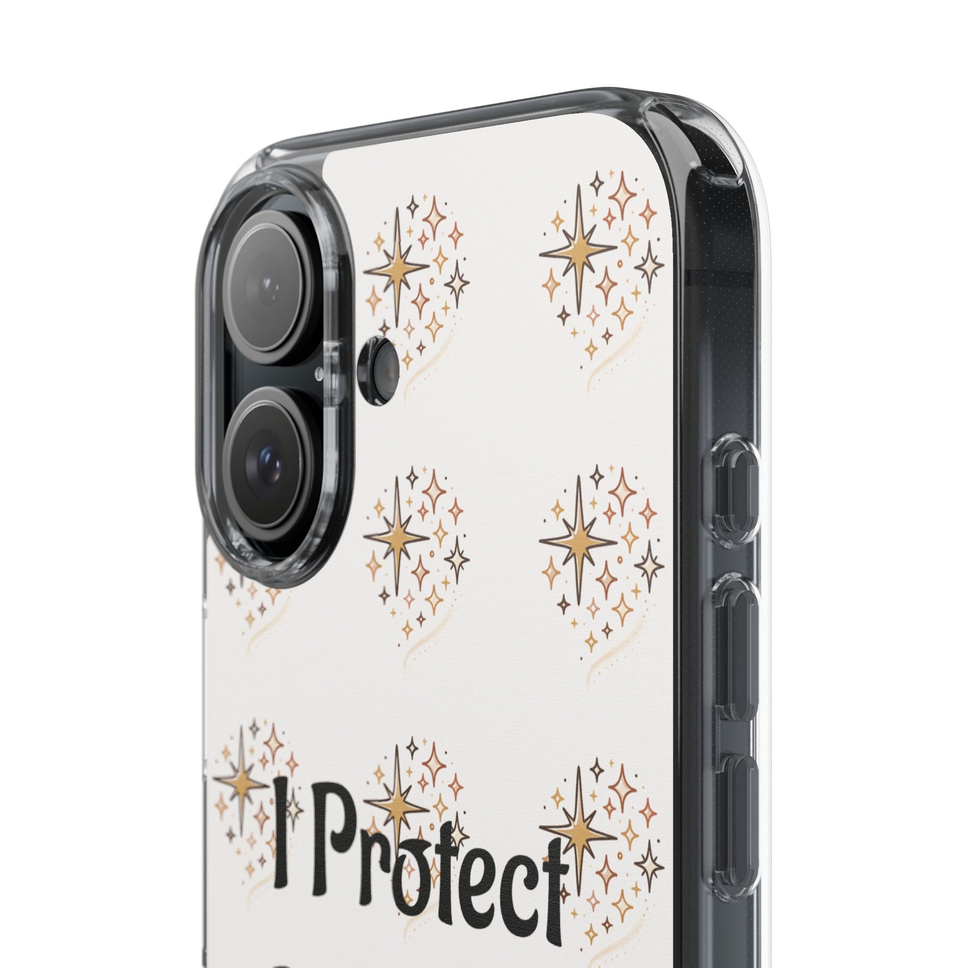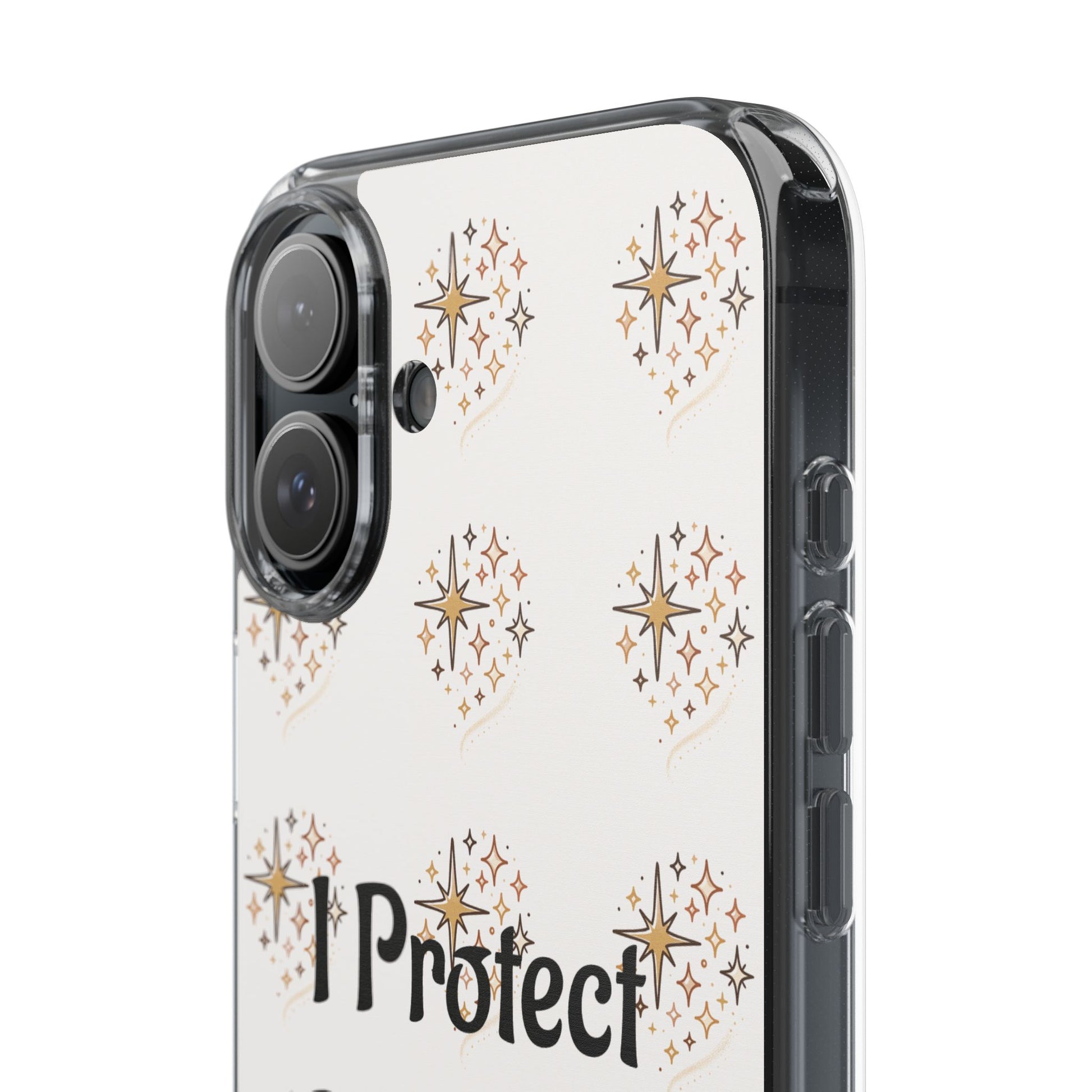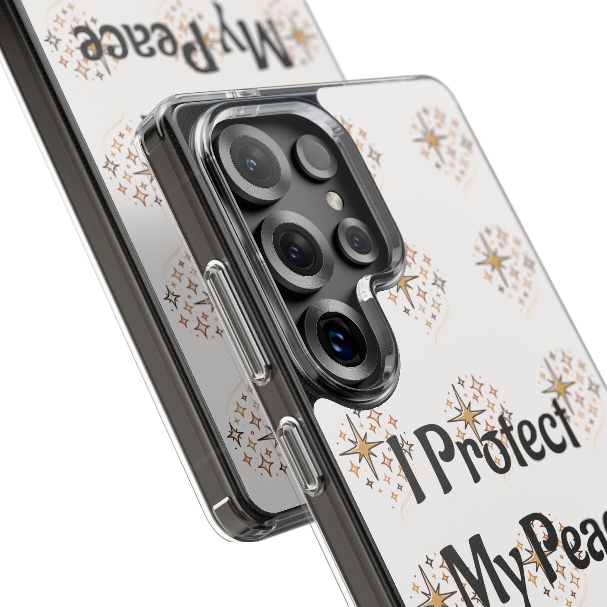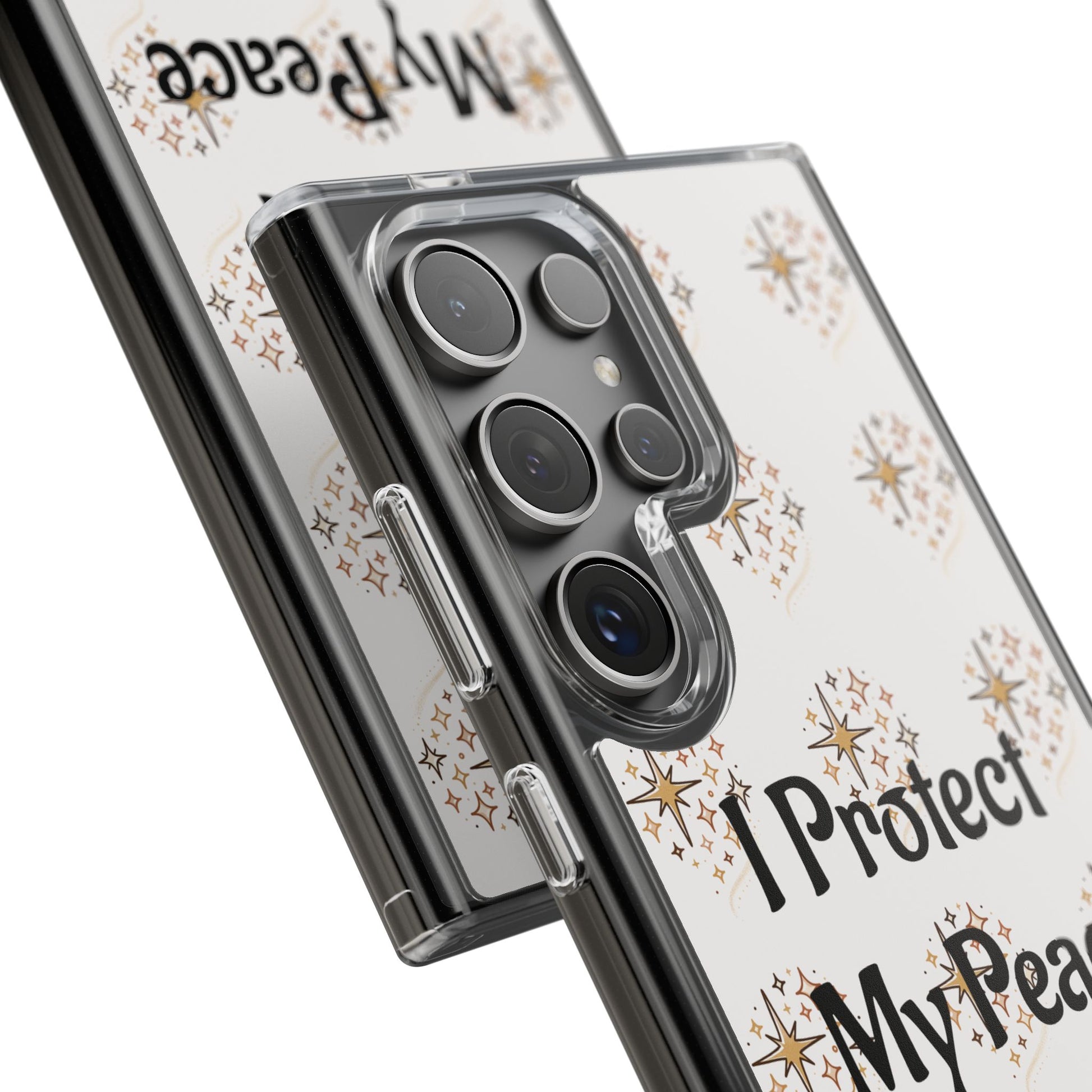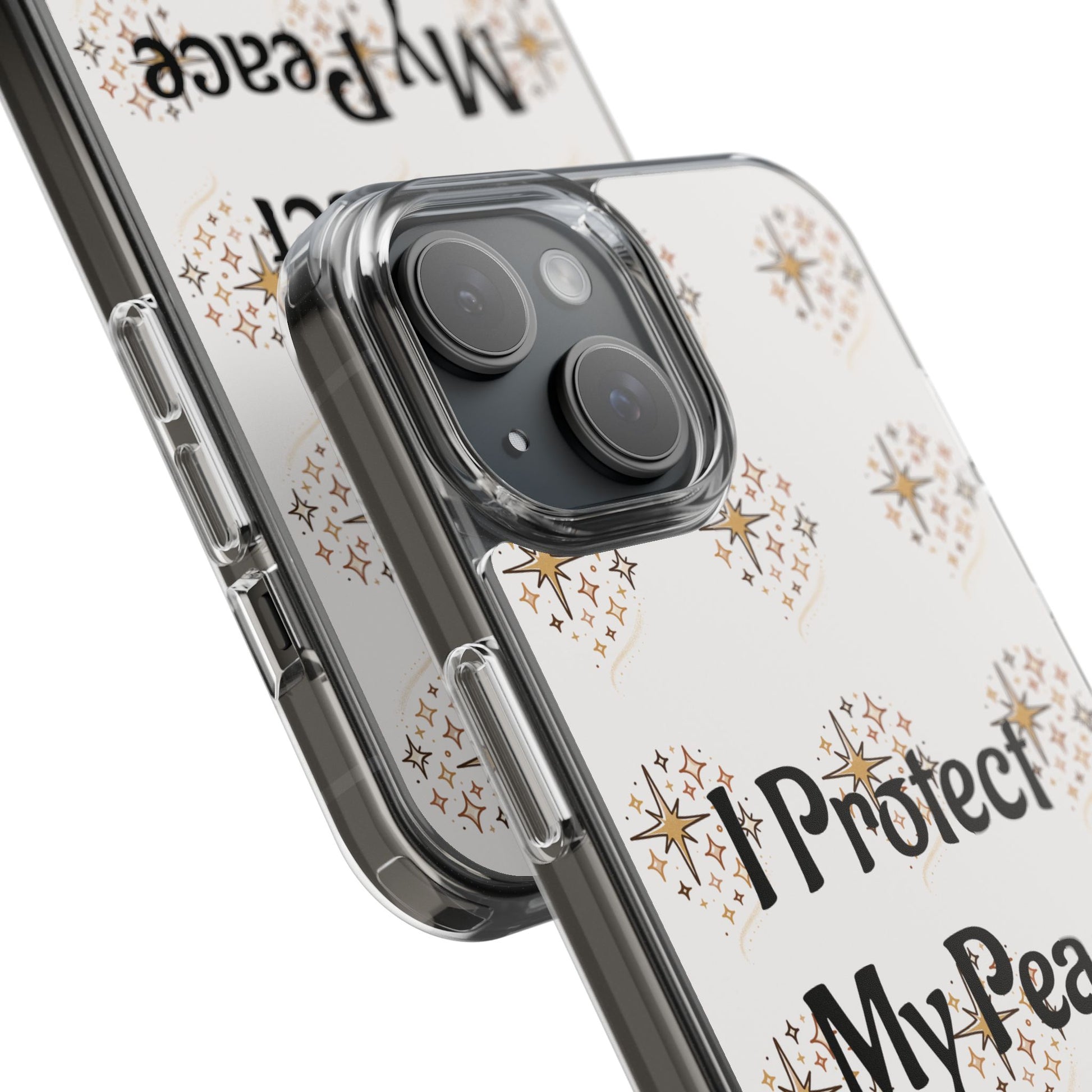 A clear, slim phone case that blends gentle protection with a calm, personal statement. The translucent polycarbonate back showcases a soft, repeating starburst pattern around the centered phrase “I Protect My Peace,” printed with photo-realistic, high-DPI inks that remain vivid edge-to-edge. Smooth glossy or matte finishes lock the design beneath the surface for long-lasting wear, while flexible TPU sides absorb shocks and keep the profile sleek. It slips into everyday life — on a work desk, in a bag, or in a quiet moment at home — letting the owner carry a mindful reminder without sacrificing modern functionality like wireless charging and open port access.
