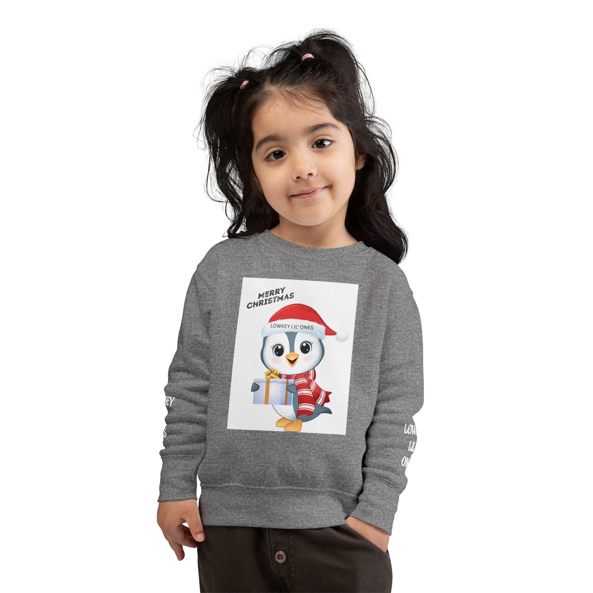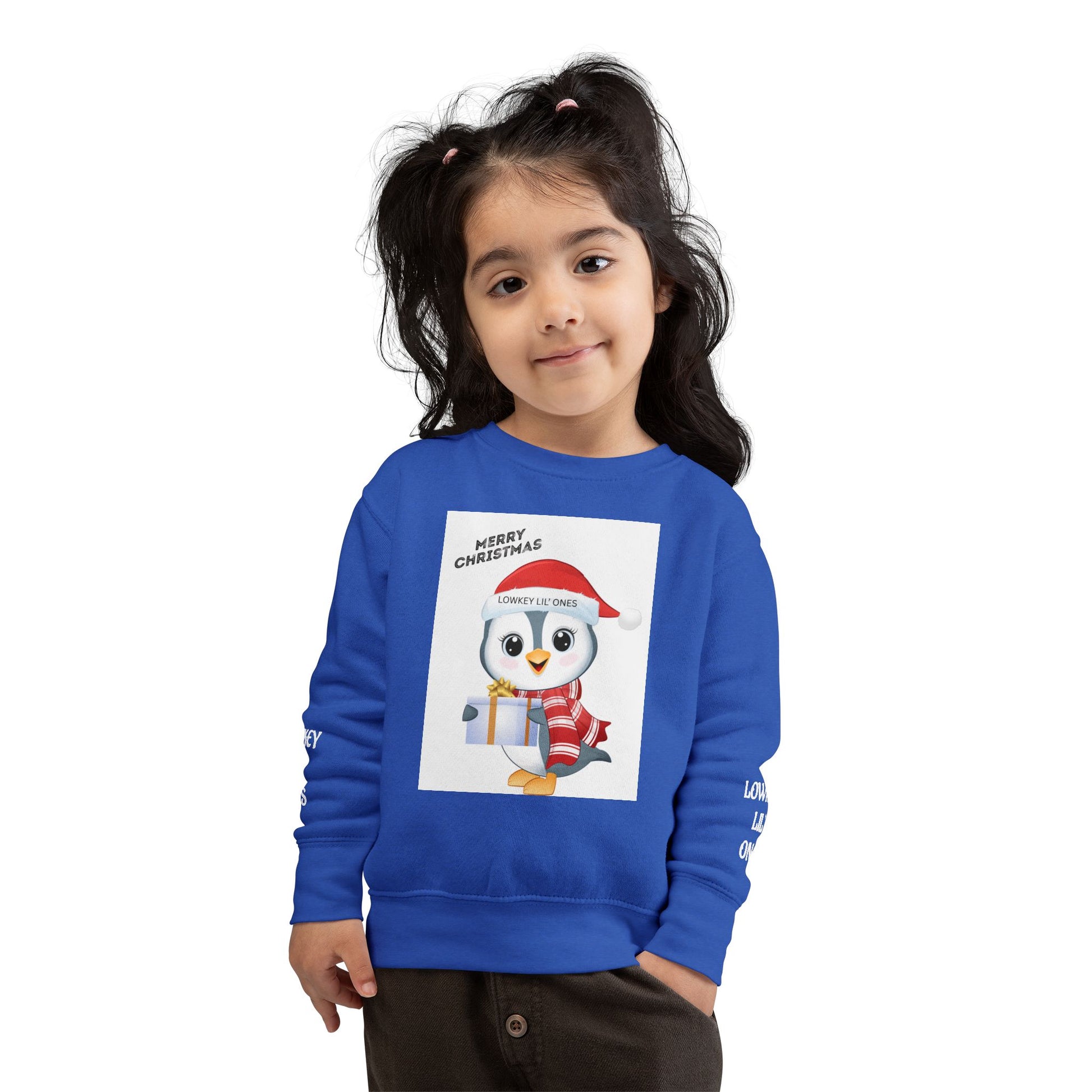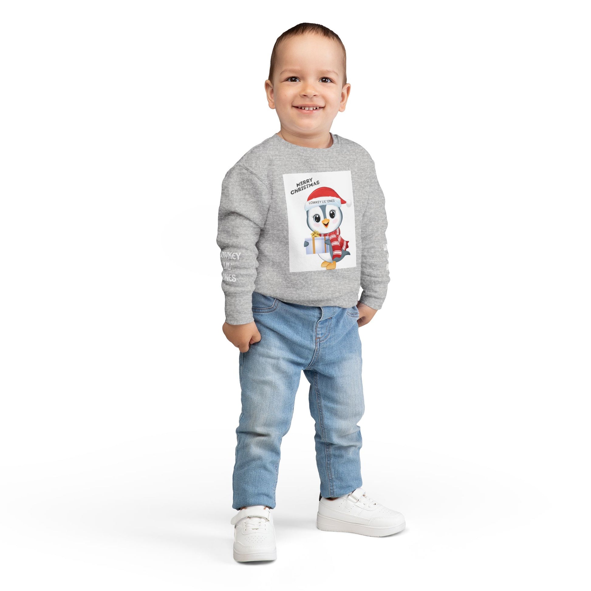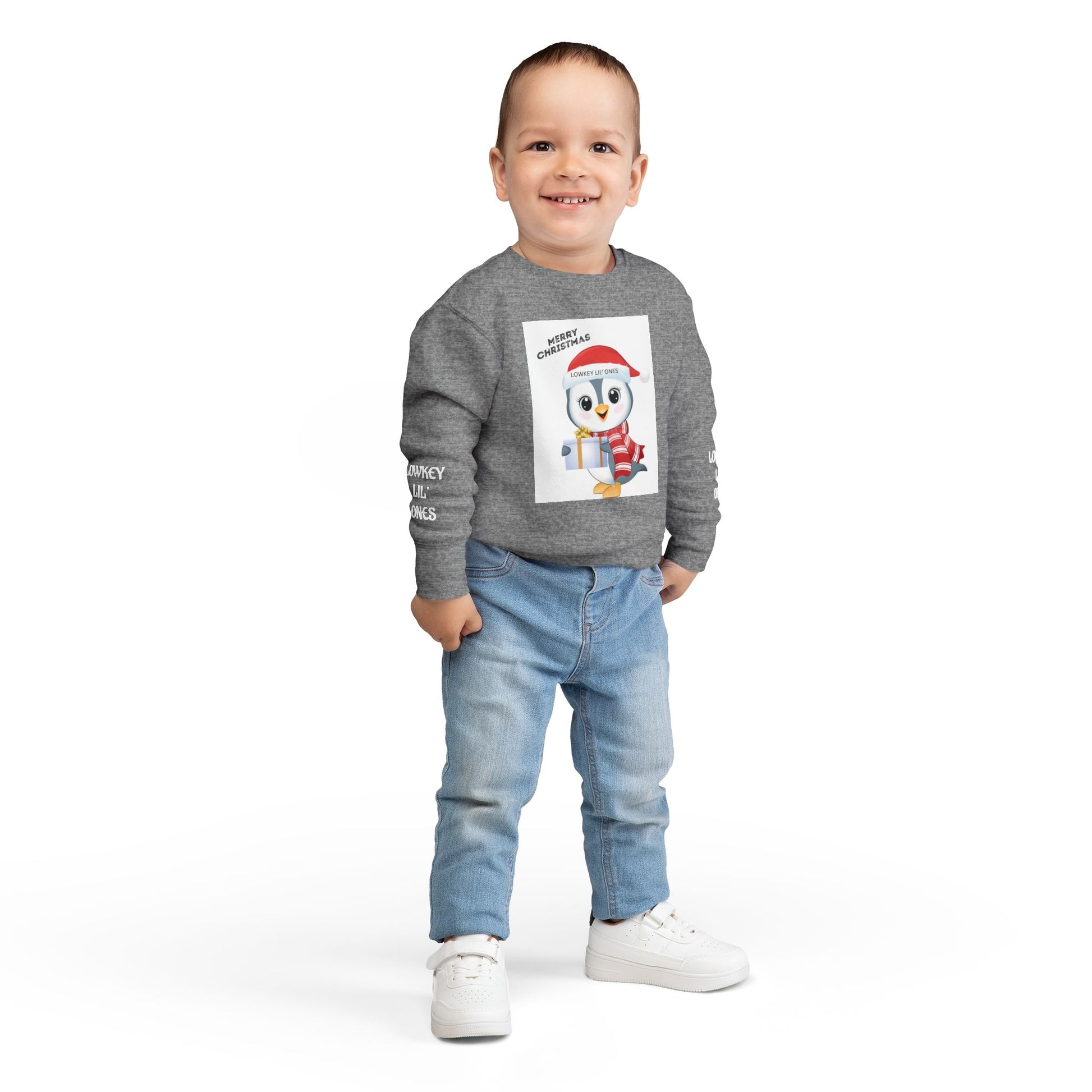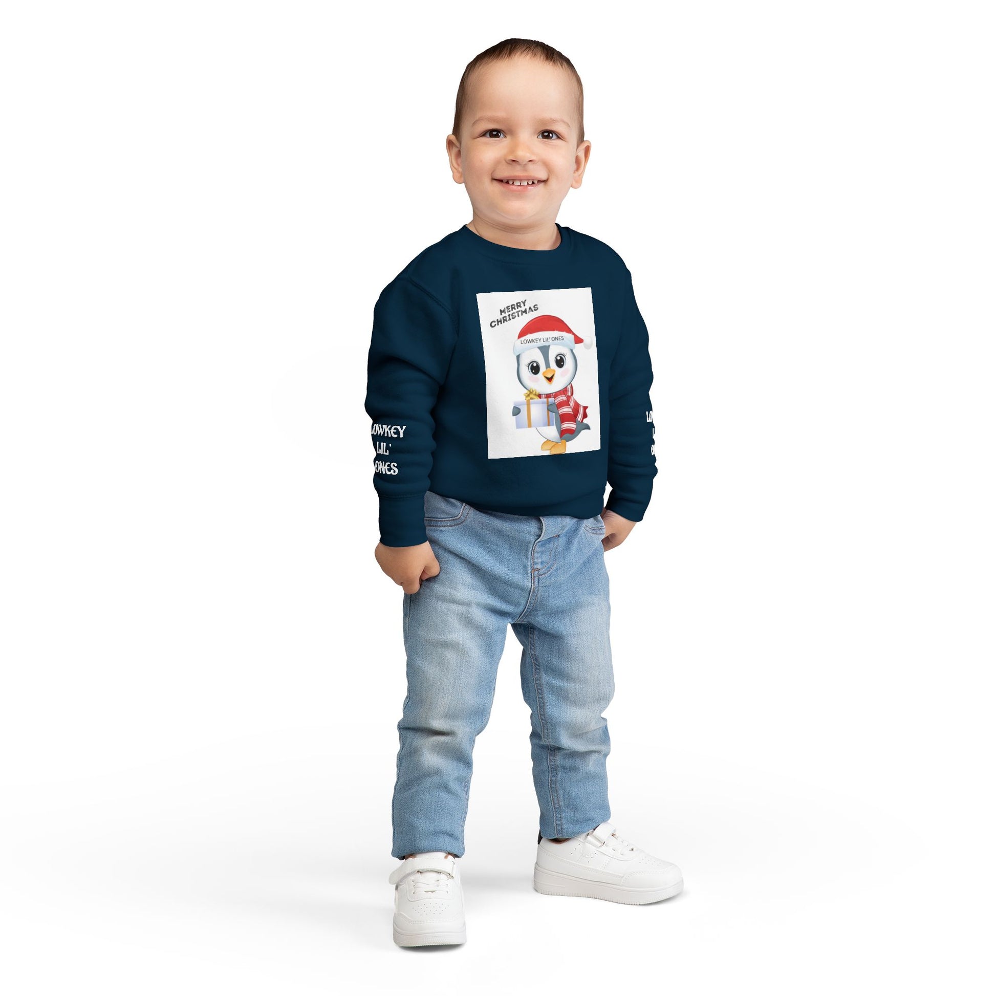Let your little one spread holiday cheer in the Lowkey Lil' Ones Merry Christmas Penguin Toddler Sweater. Featuring an adorable festive penguin holding a gift and rocking a santa hat, this cozy sweater is perfect for Christmas outings, family photos school parties, and snuggly winter days. Soft, comfy, and kid- approved for all- day wear, it's made for tiny trendsetters who love staying warm while looking cute. Holiday magic, the Lowkey Lil' Ones way.