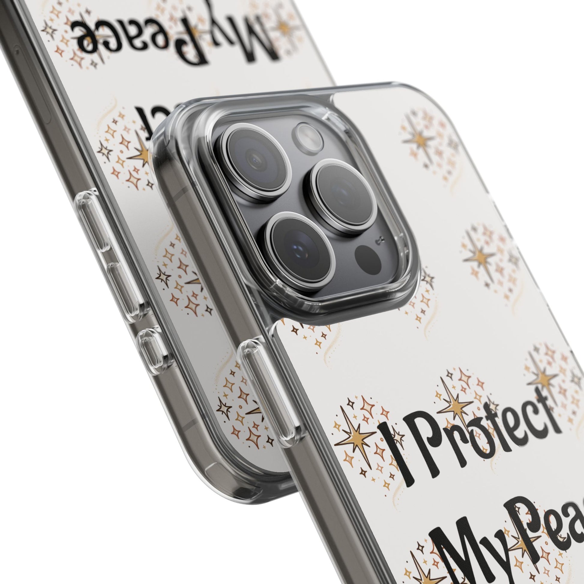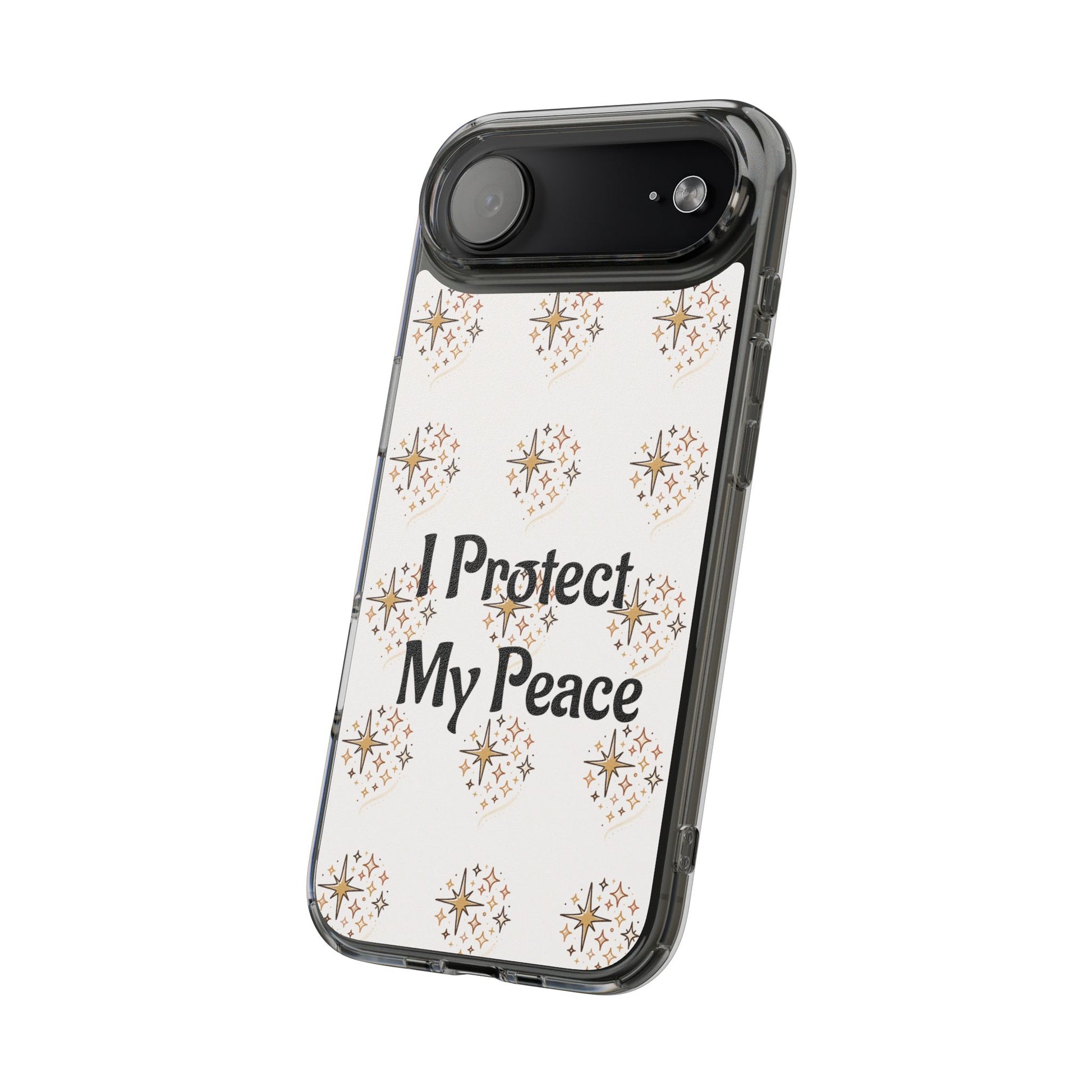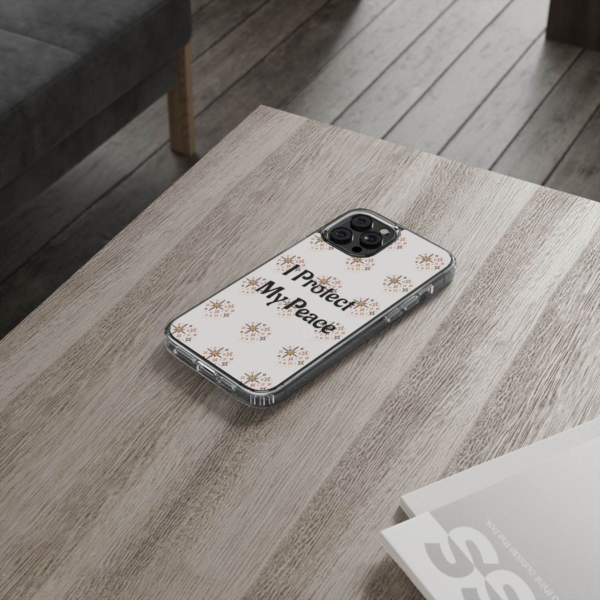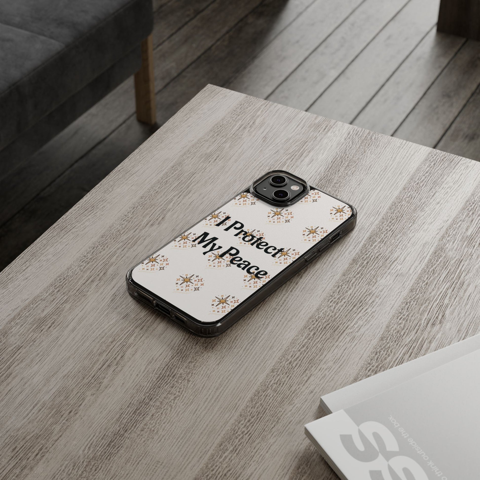 A clear, slim phone case that blends gentle protection with a calm, personal statement. The translucent polycarbonate back showcases a soft, repeating starburst pattern around the centered phrase “I Protect My Peace,” printed with photo-realistic, high-DPI inks that remain vivid edge-to-edge. Smooth glossy or matte finishes lock the design beneath the surface for long-lasting wear, while flexible TPU sides absorb shocks and keep the profile sleek. It slips into everyday life — on a work desk, in a bag, or in a quiet moment at home — letting the owner carry a mindful reminder without sacrificing modern functionality like wireless charging and open port access.